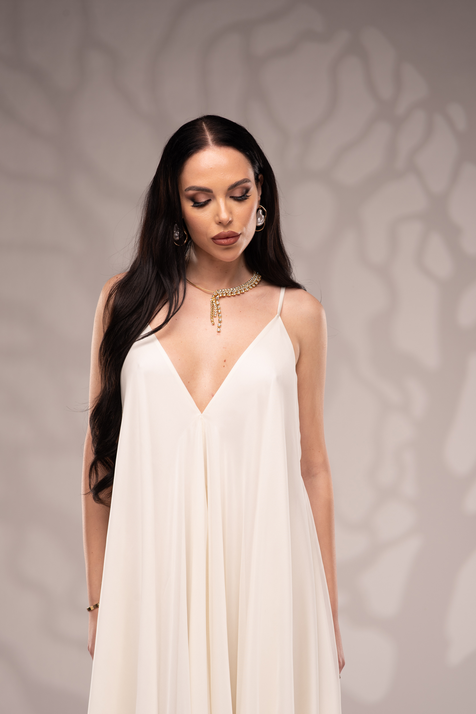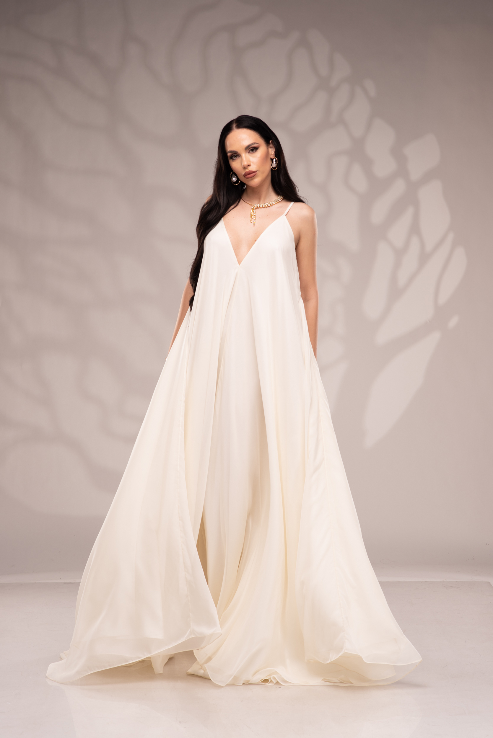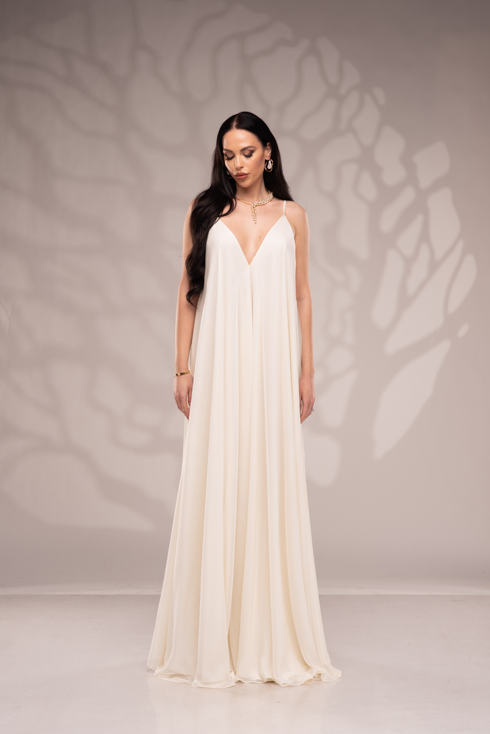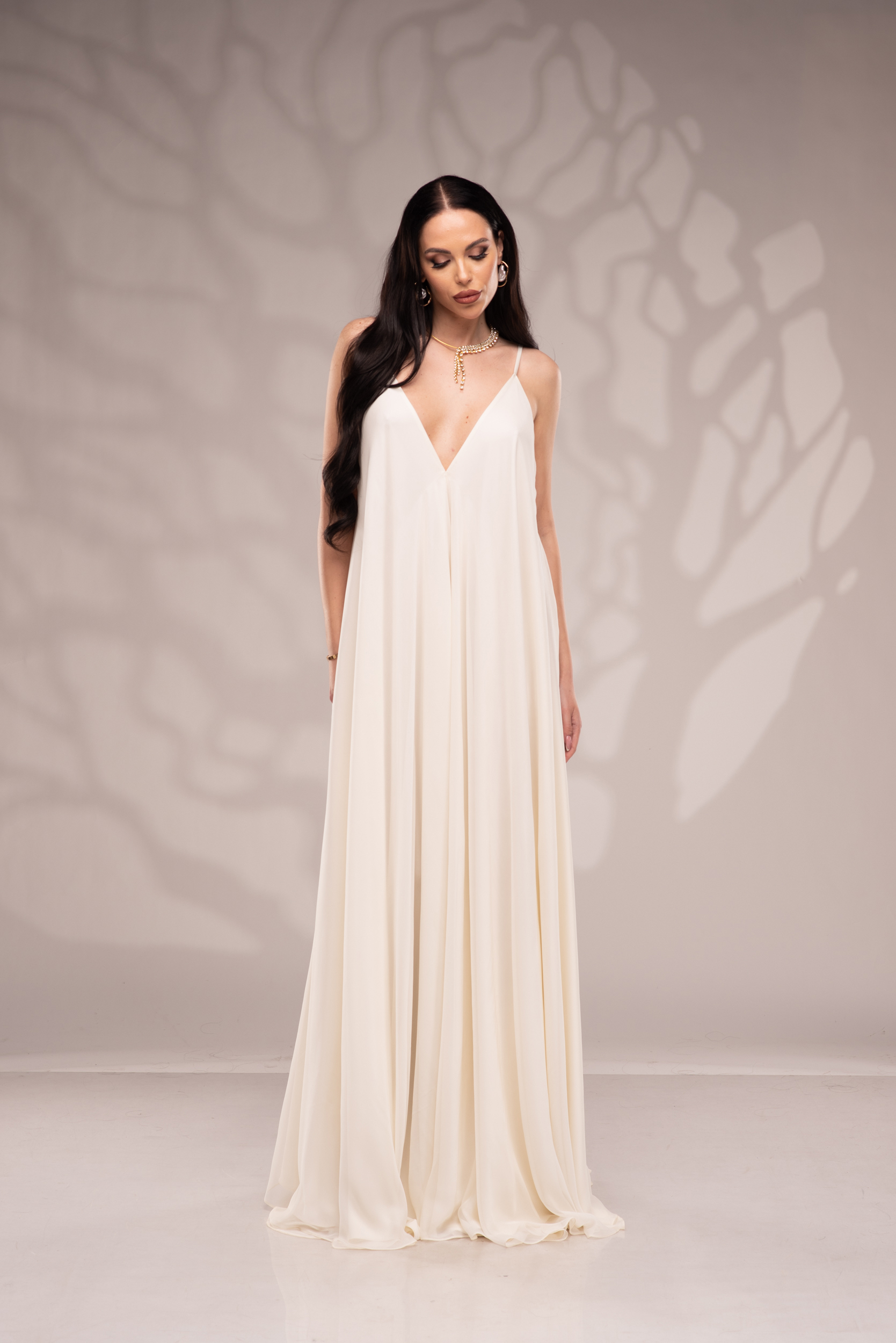 Рокля Nicolette е олицетворение на фина елегантност и съвременна женственост, част от колекцията „Градината на сетивата“. Създадена от ефирен воал и луксозна ацетатна коприна, тя се разлива меко по тялото, обгръщайки го с лекота и въздушност. Цветът шампанско придава деликатен блясък и благородно излъчване, без нужда от допълнителни детайли или принтове. Моделът е с V-образно деколте и тънки регулируеми презрамки, които подчертават линията на раменете с нежност. Свободната кройка пасва на всяка фигура и ръст, създавайки усещане за естествена грация. Роклята Nicolette не просто се носи – тя разказва историята на съвременната муза, която сияе с лекота и увереност.