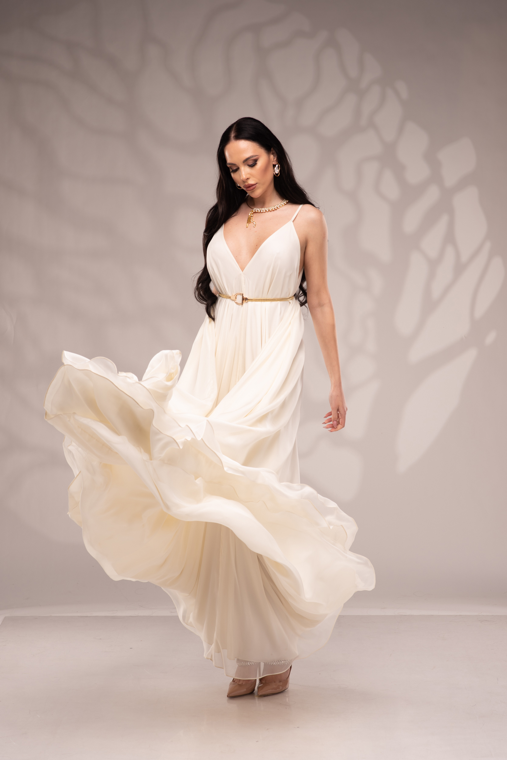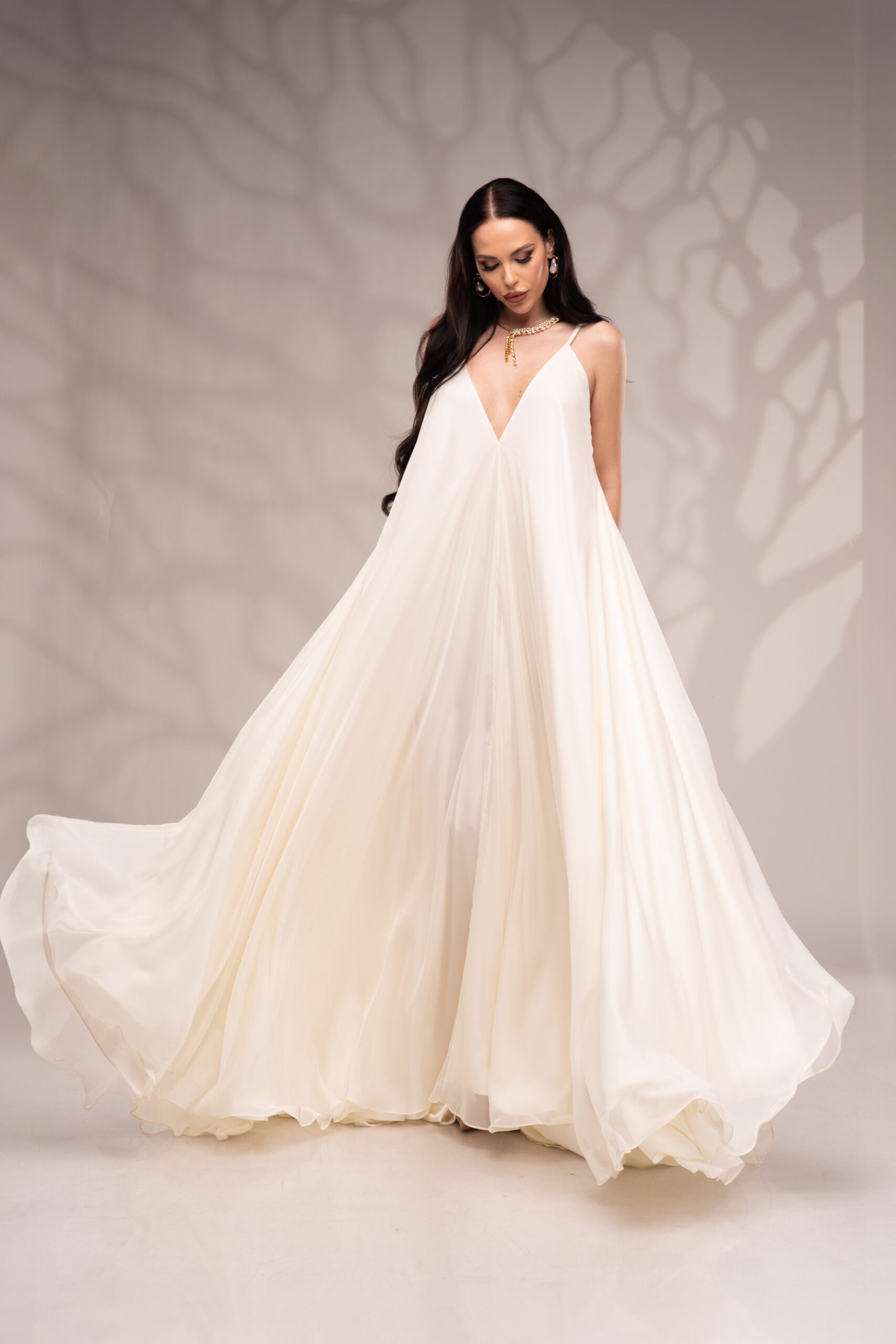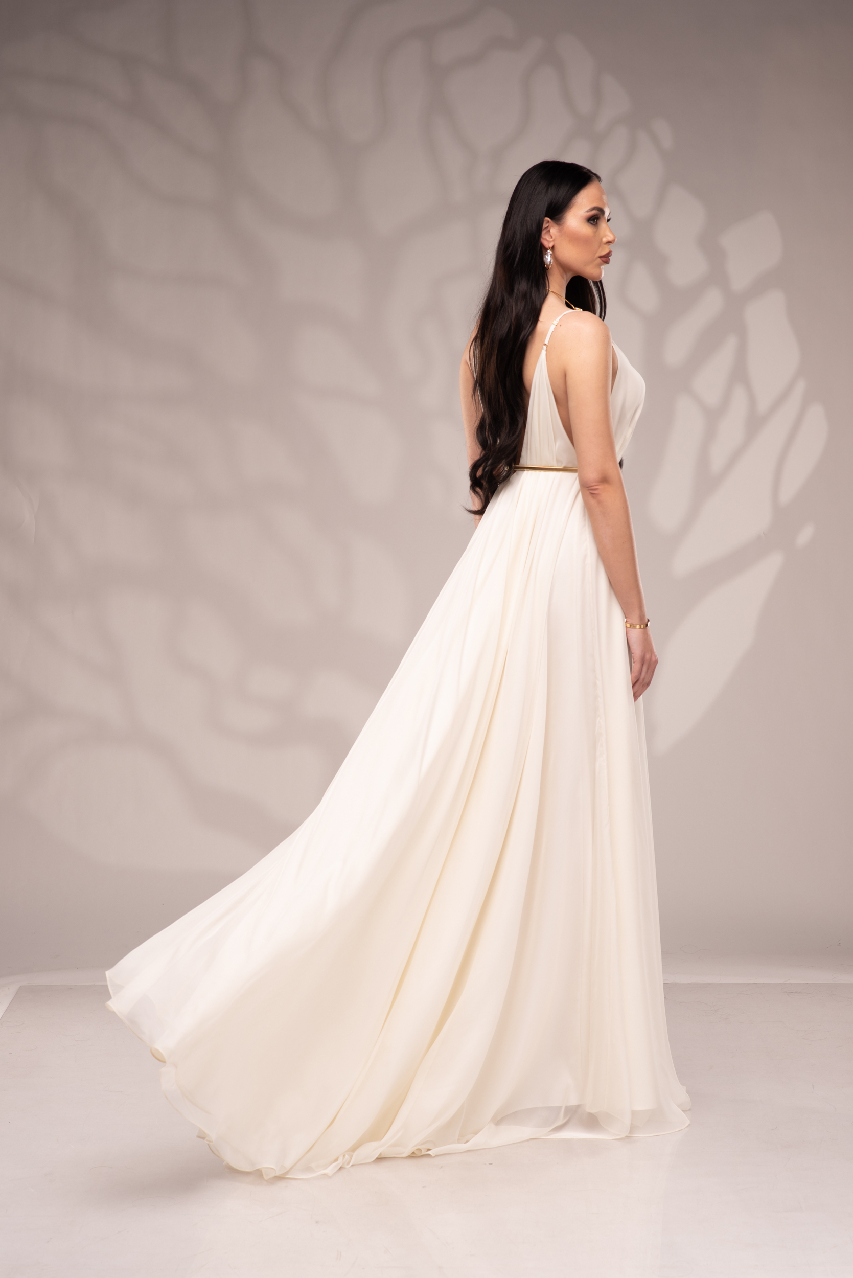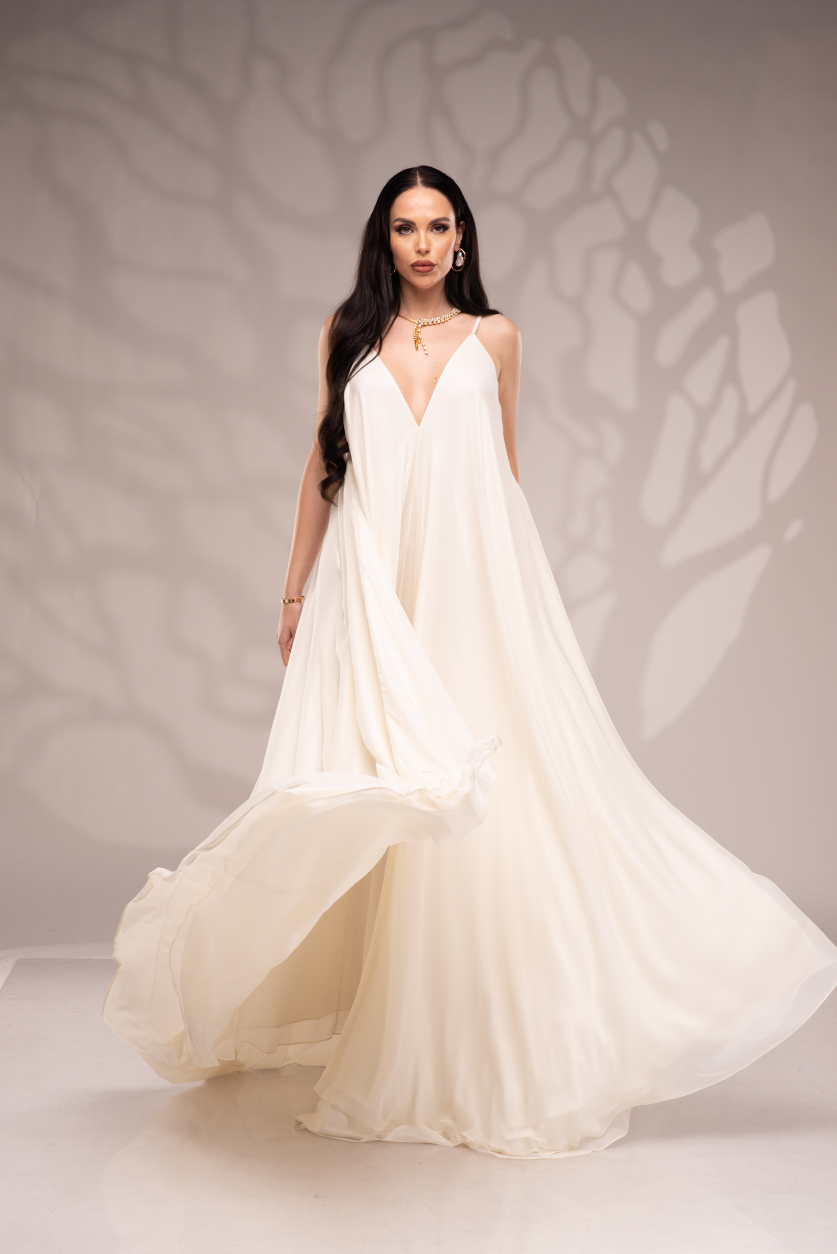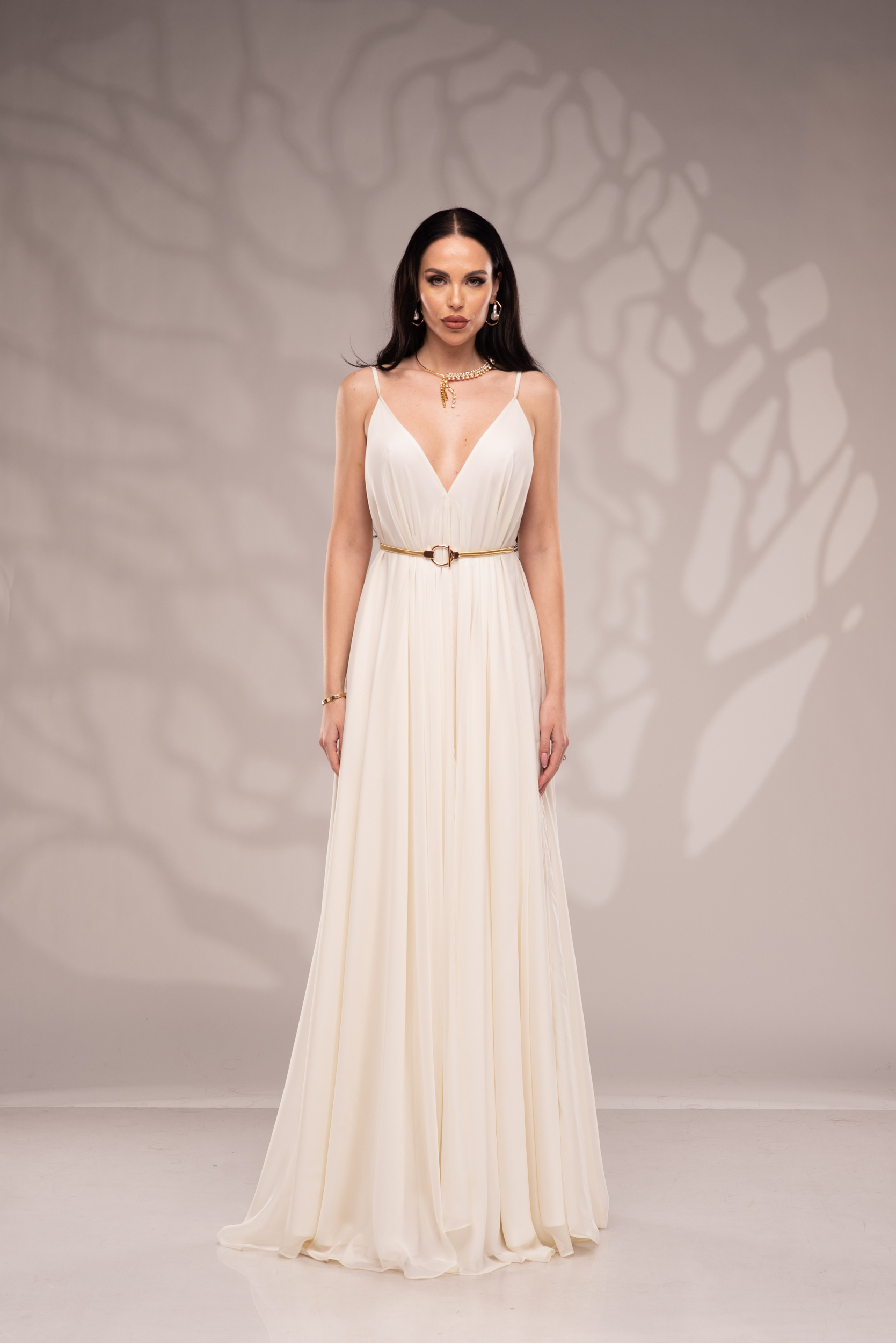 Рокля Nicolette е олицетворение на фина елегантност и съвременна женственост, част от колекцията „Градината на сетивата“. Създадена от ефирен воал и луксозна ацетатна коприна, тя се разлива меко по тялото, обгръщайки го с лекота и въздушност. Цветът шампанско придава деликатен блясък и благородно излъчване, без нужда от допълнителни детайли или принтове. Моделът е с V-образно деколте и тънки регулируеми презрамки, които подчертават линията на раменете с нежност. Свободната кройка пасва на всяка фигура и ръст, създавайки усещане за естествена грация. Роклята Nicolette не просто се носи – тя разказва историята на съвременната муза, която сияе с лекота и увереност.
