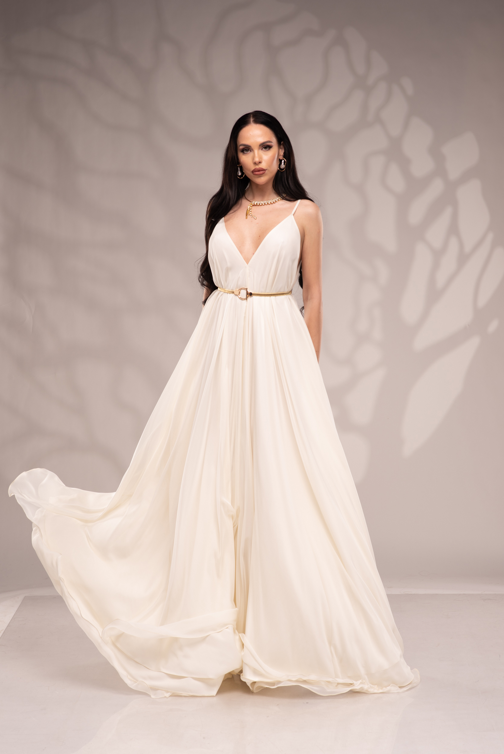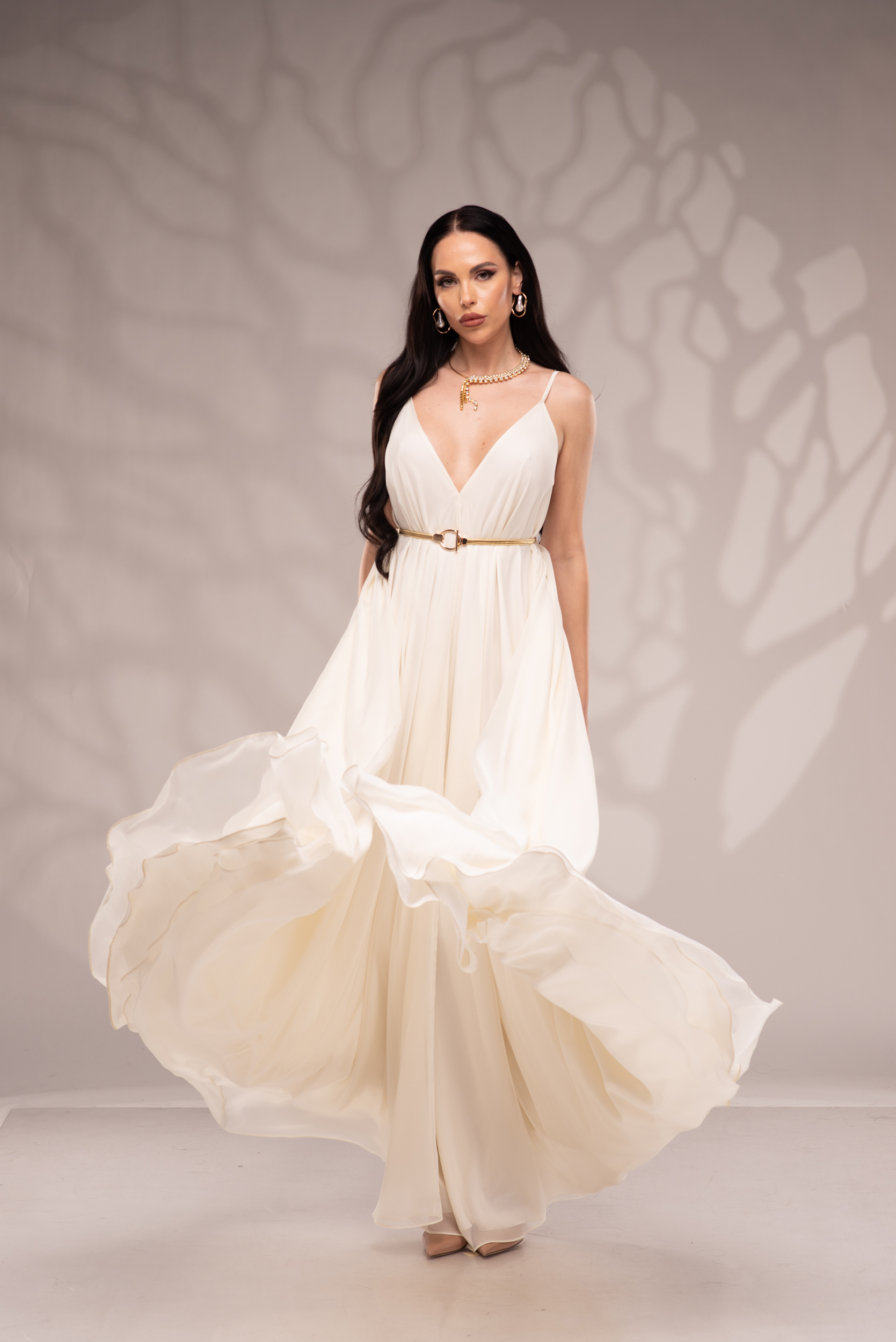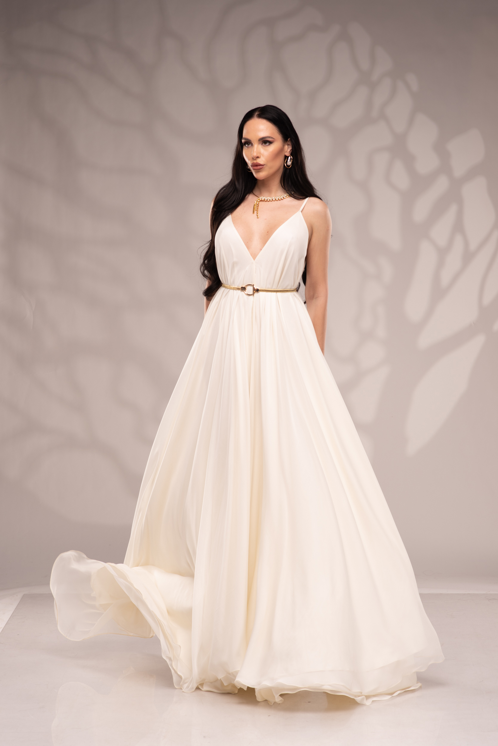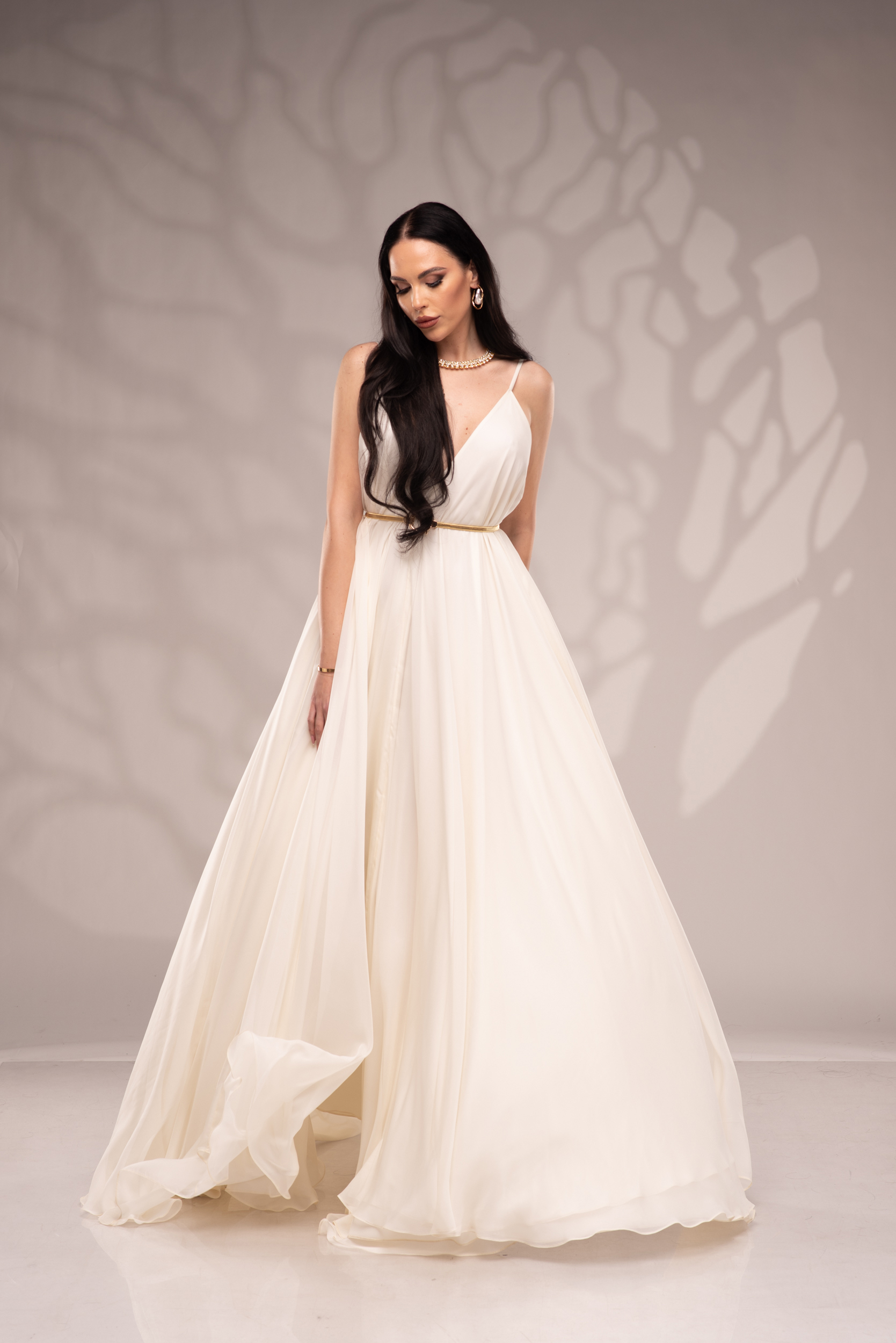 Рокля Nicolette е олицетворение на фина елегантност и съвременна женственост, част от колекцията „Градината на сетивата“. Създадена от ефирен воал и луксозна ацетатна коприна, тя се разлива меко по тялото, обгръщайки го с лекота и въздушност. Цветът шампанско придава деликатен блясък и благородно излъчване, без нужда от допълнителни детайли или принтове. Моделът е с V-образно деколте и тънки регулируеми презрамки, които подчертават линията на раменете с нежност. Свободната кройка пасва на всяка фигура и ръст, създавайки усещане за естествена грация. Роклята Nicolette не просто се носи – тя разказва историята на съвременната муза, която сияе с лекота и увереност.