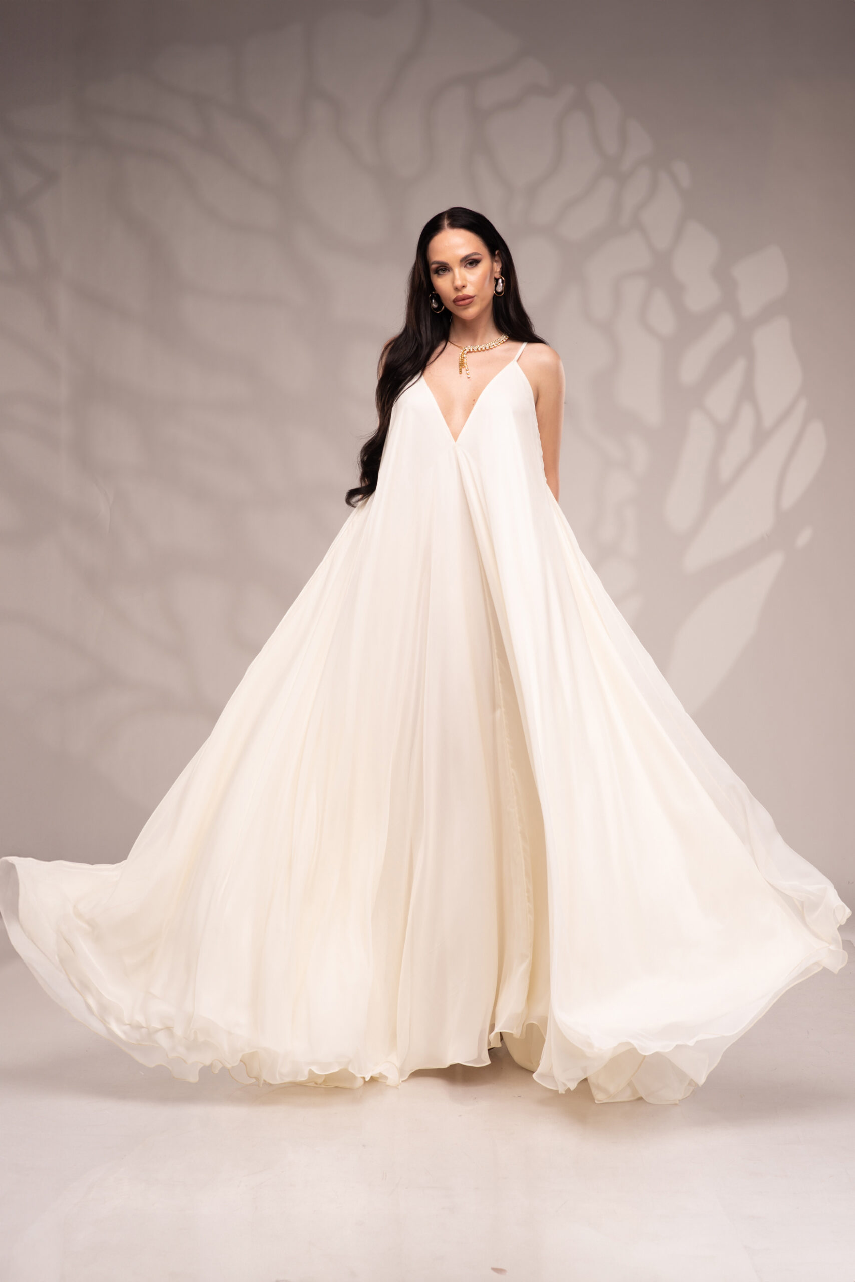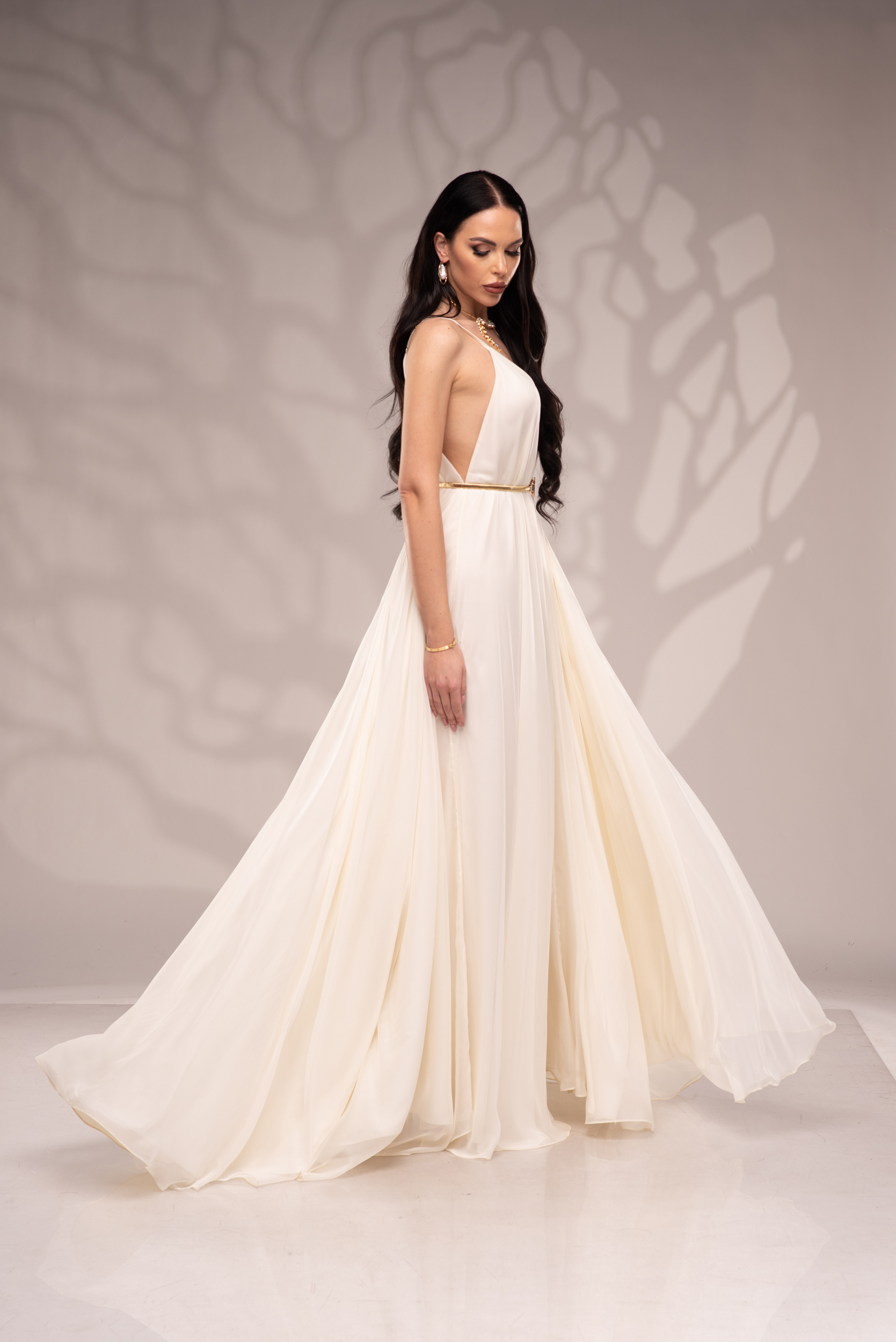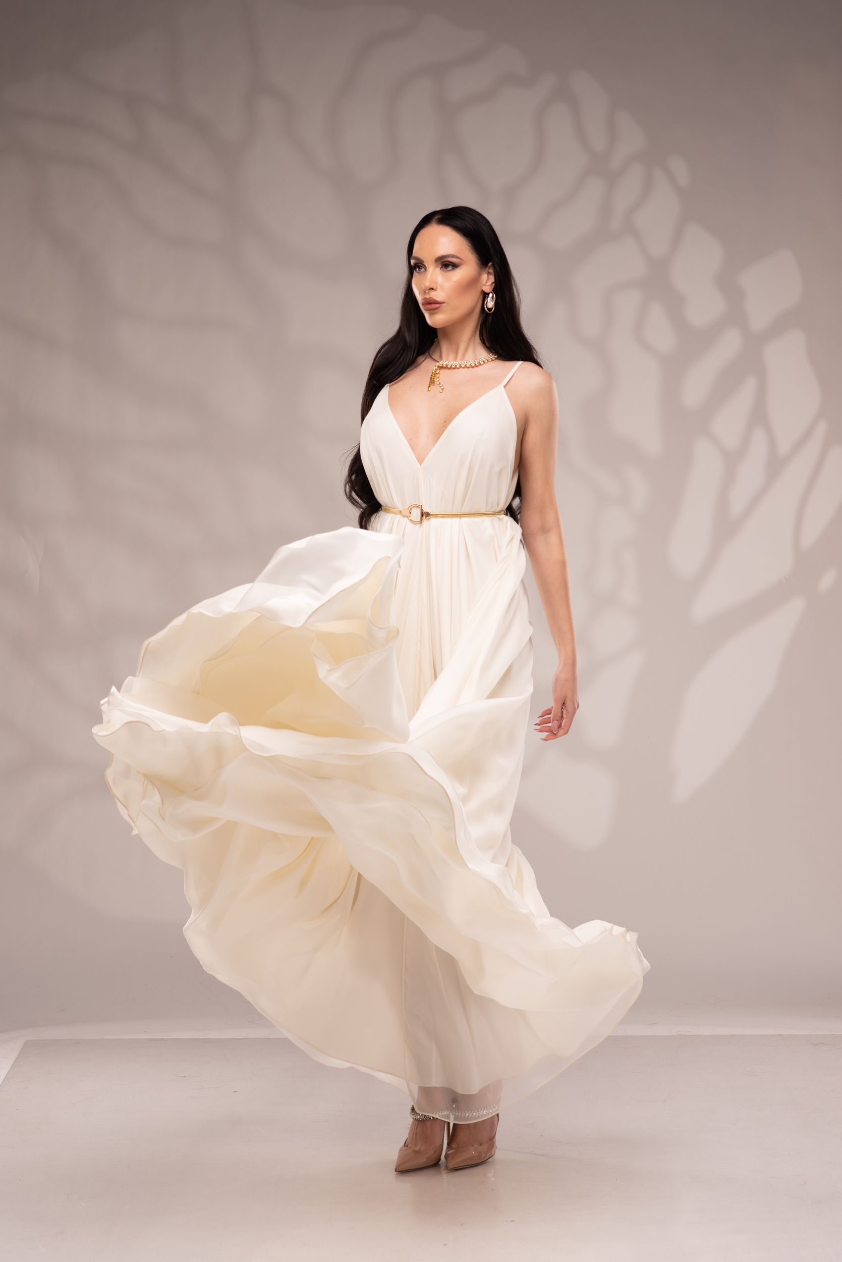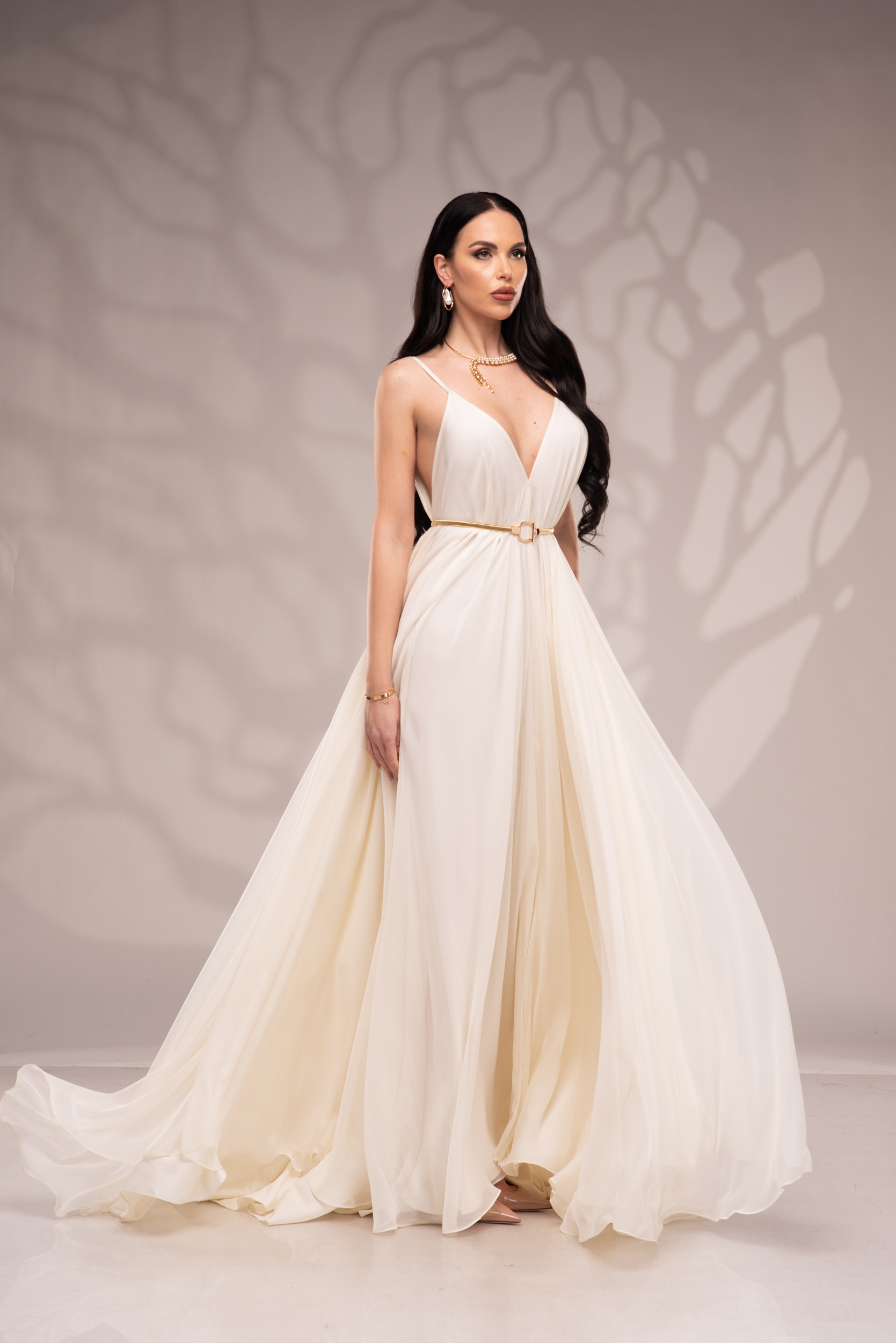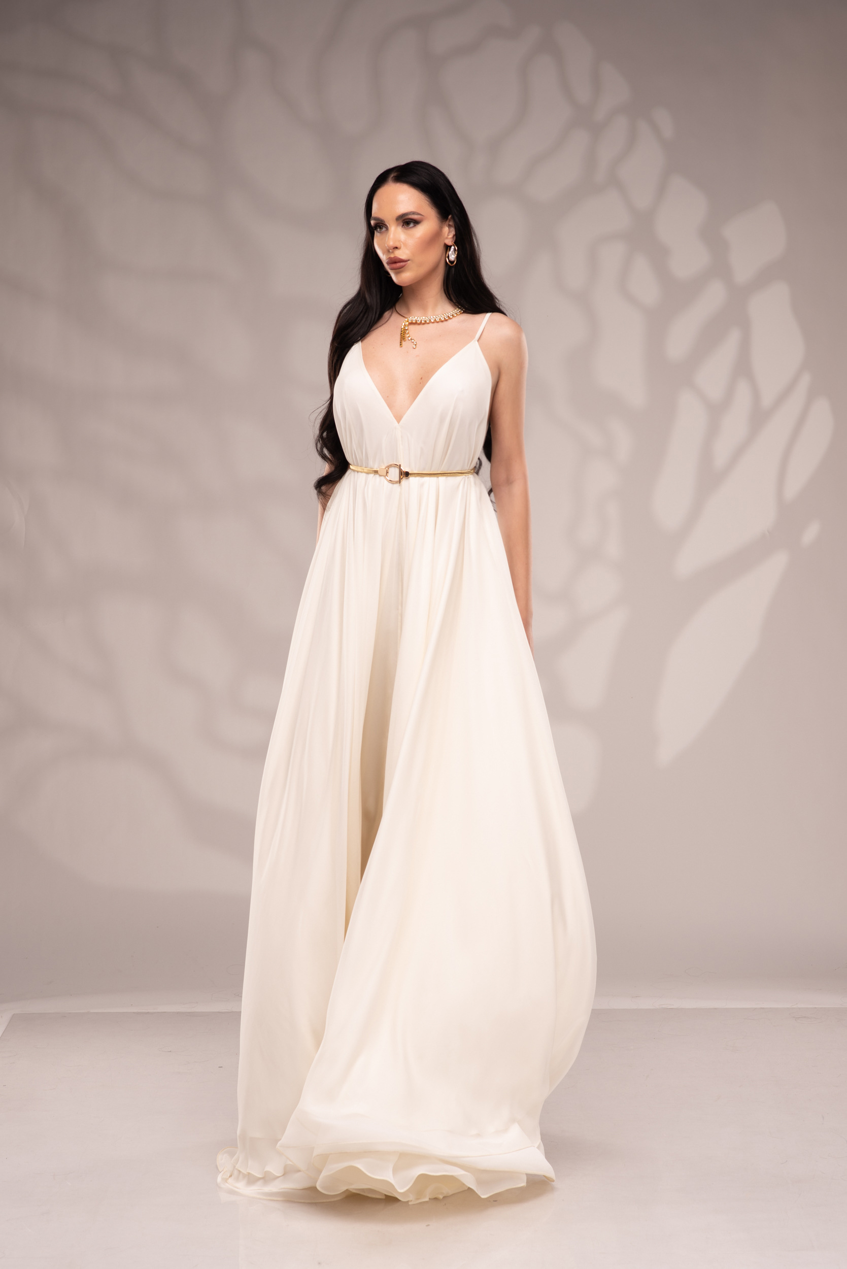 Рокля Nicolette е олицетворение на фина елегантност и съвременна женственост, част от колекцията „Градината на сетивата“. Създадена от ефирен воал и луксозна ацетатна коприна, тя се разлива меко по тялото, обгръщайки го с лекота и въздушност. Цветът шампанско придава деликатен блясък и благородно излъчване, без нужда от допълнителни детайли или принтове. Моделът е с V-образно деколте и тънки регулируеми презрамки, които подчертават линията на раменете с нежност. Свободната кройка пасва на всяка фигура и ръст, създавайки усещане за естествена грация. Роклята Nicolette не просто се носи – тя разказва историята на съвременната муза, която сияе с лекота и увереност.