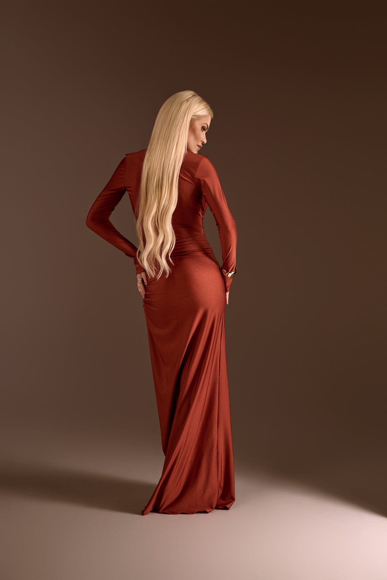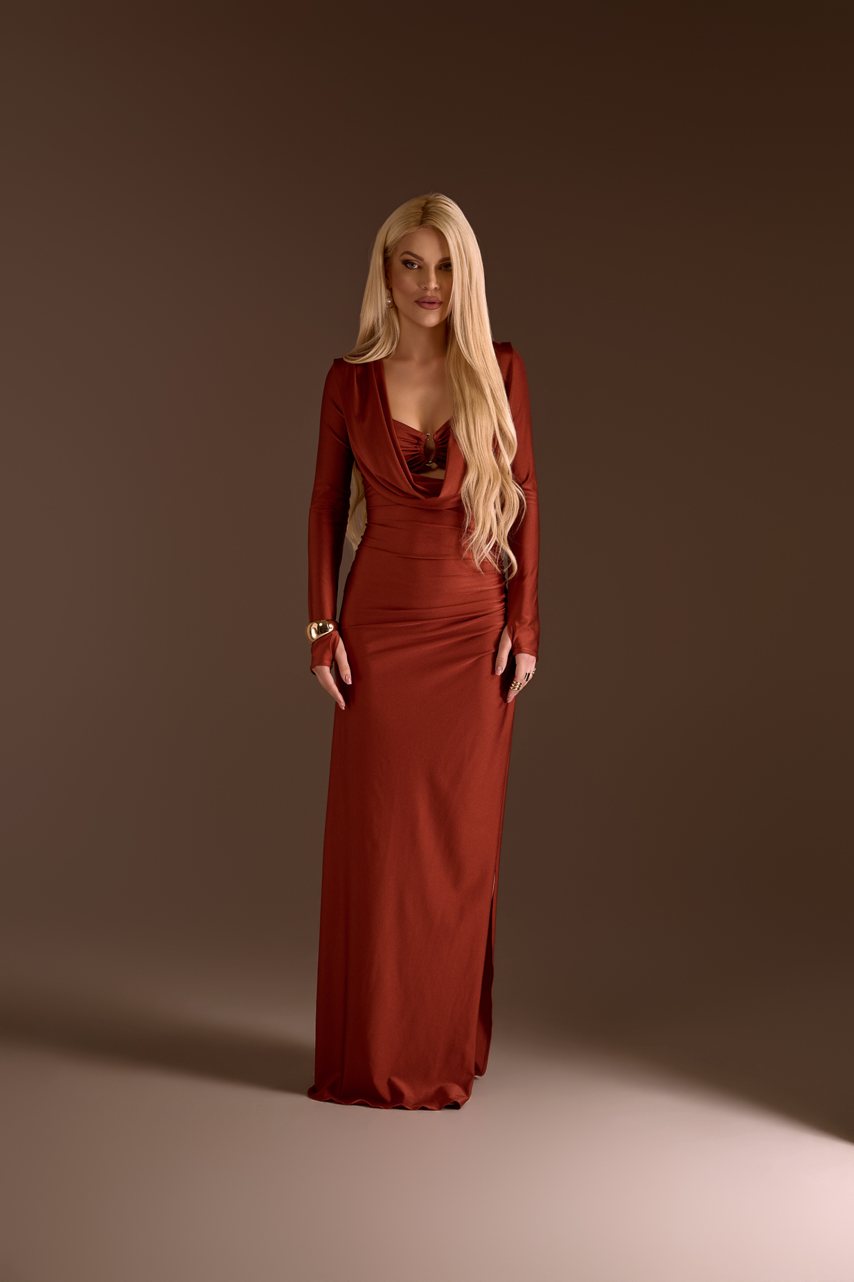 Елегантна дълга рокля с fluid draped neckline и изящен sculpted silhouette, създадена да подчертава женствеността с меко и съблазнително излъчване. Изработена от фина еластична ликра с деликатен сатениран блясък, роклята прилепва нежно по тялото и създава усещане за effortless elegance.