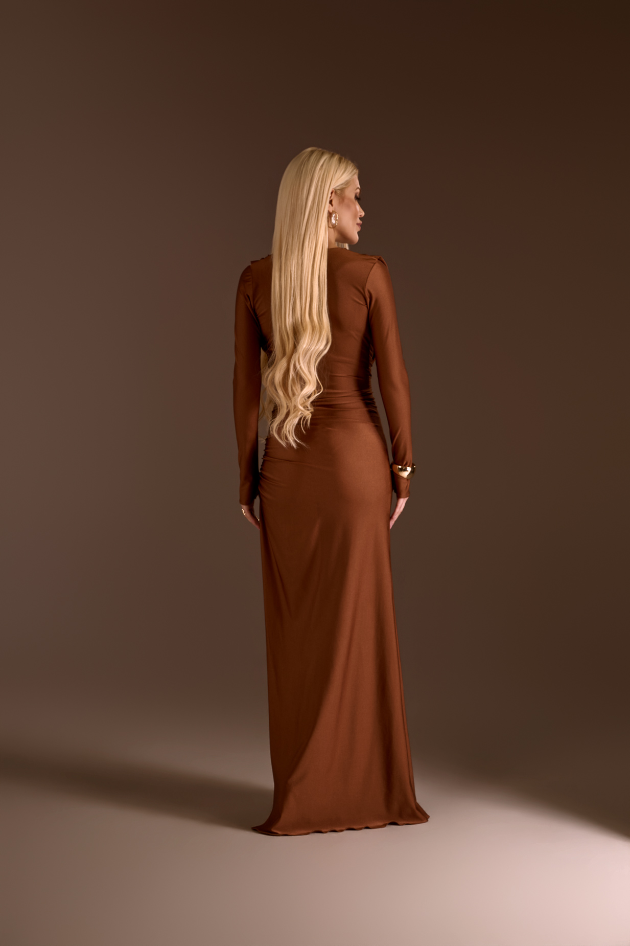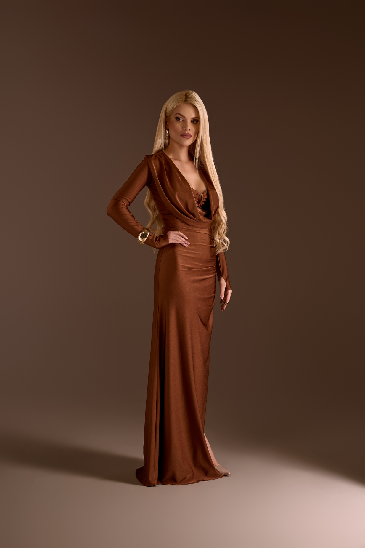 Елегантна дълга рокля с fluid draped neckline и изящен sculpted silhouette, създадена да подчертава женствеността с меко и съблазнително излъчване. Изработена от фина еластична ликра с деликатен сатениран блясък, роклята прилепва нежно по тялото и създава усещане за effortless elegance.