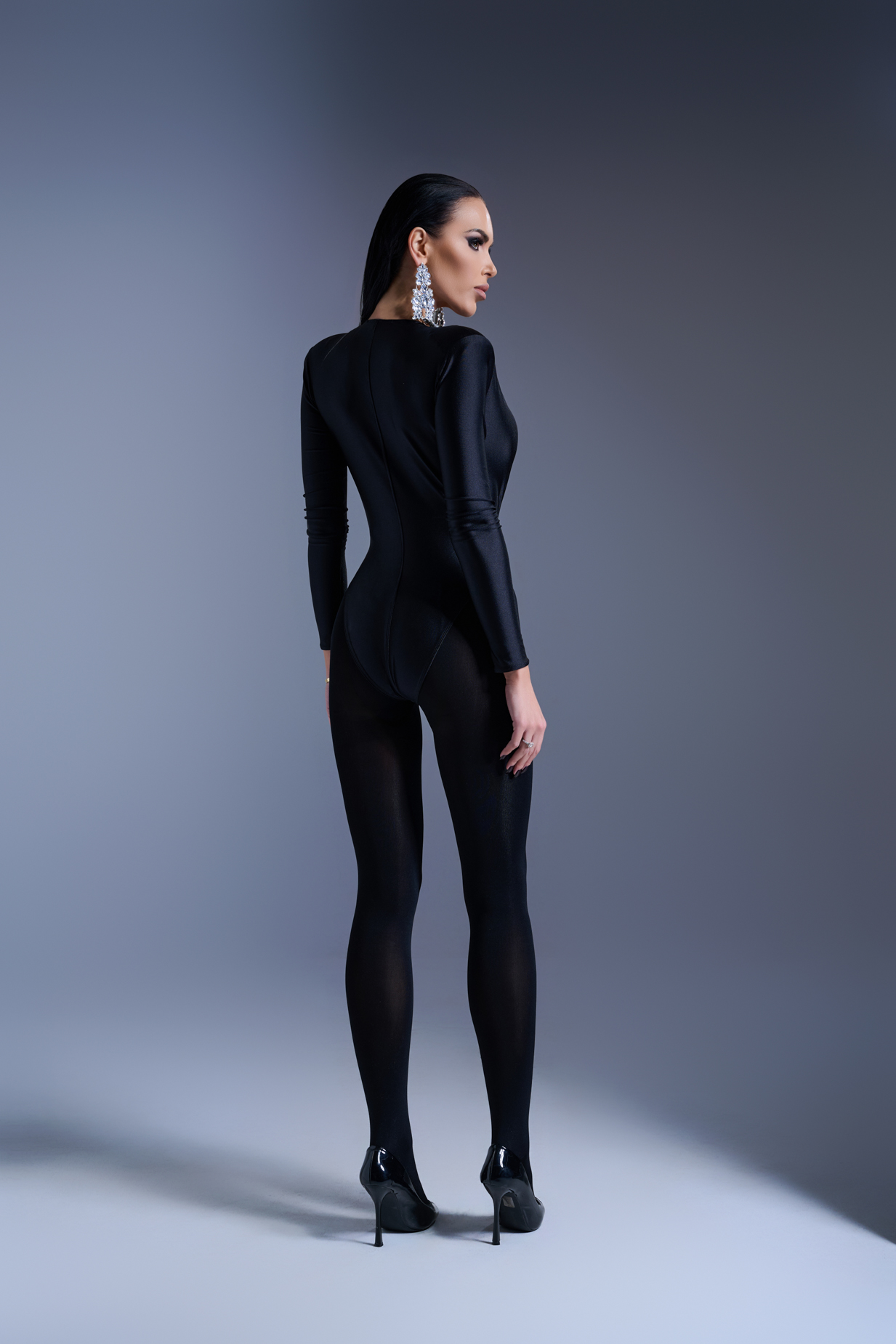 Боди от еластична материя с фин блясък, с шал-яка и деликатен набор в горната част, който оформя изискано деколте. Може да се носи с паднали или повдигнати рамене, създавайки различни визии. Минималистичен, женствен и елегантен дизайн, който подчертава силуета и излъчва уверен, съвременен стил.
