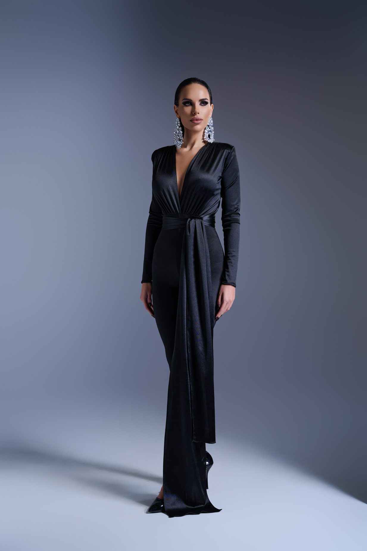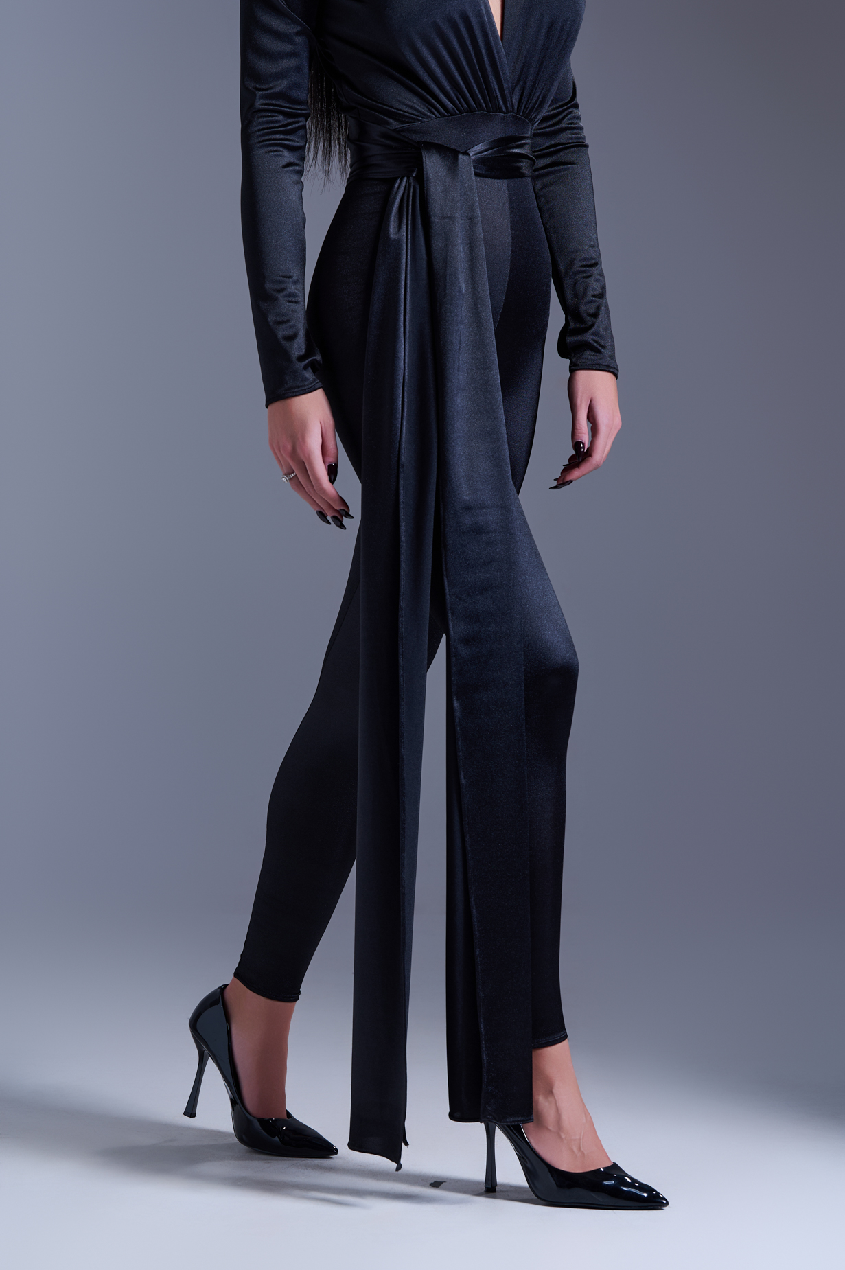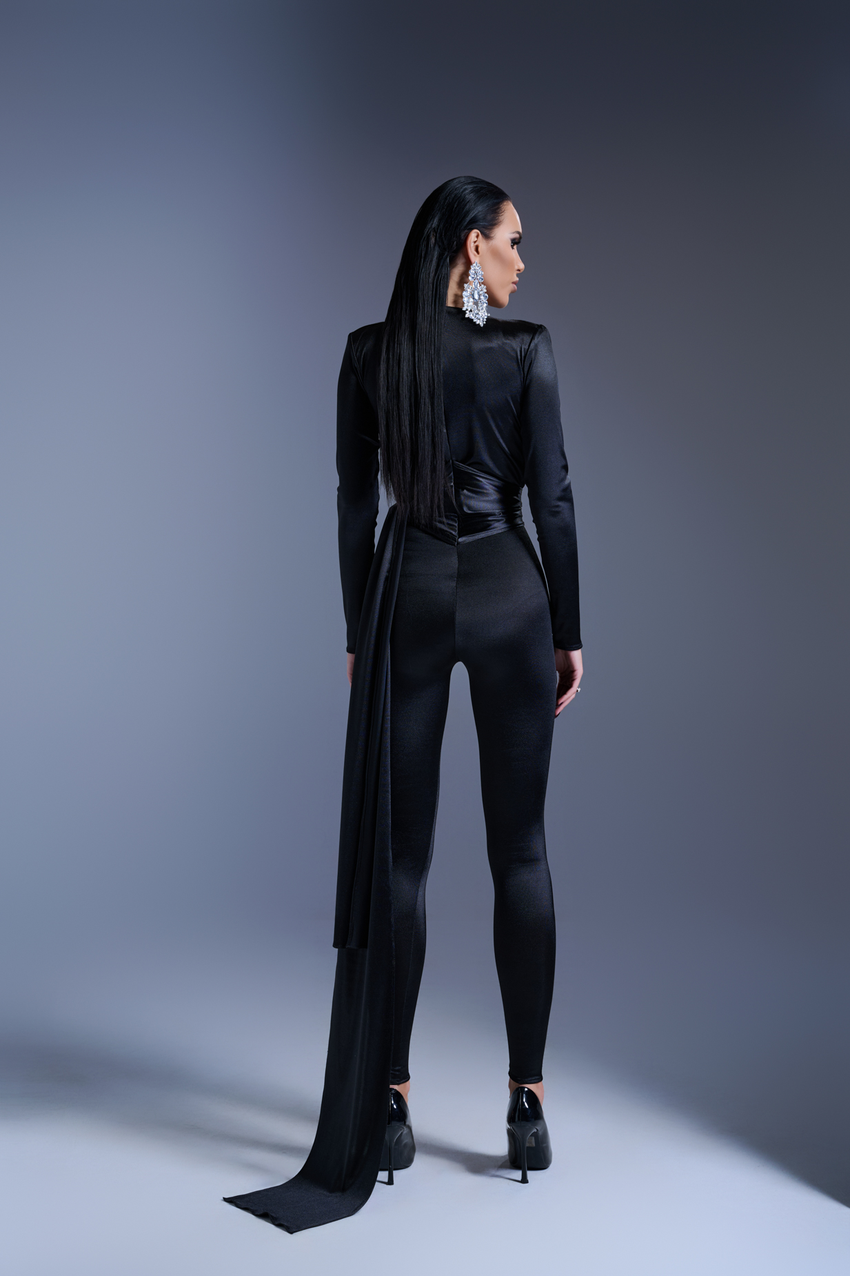 Гащеризон по тялото от плътна сатенирана еластична материя, който следва естествените линии на силуета. Дълбоко V-деколте и набор в талията извайват женствена форма, а дългите ръкави добавят изтънченост. Свободно падащите дълги шалове отпред издължават линията и придават елегантност. Минималистичен и драматичен дизайн за модерно и уверено присъствие на вечерни събития.