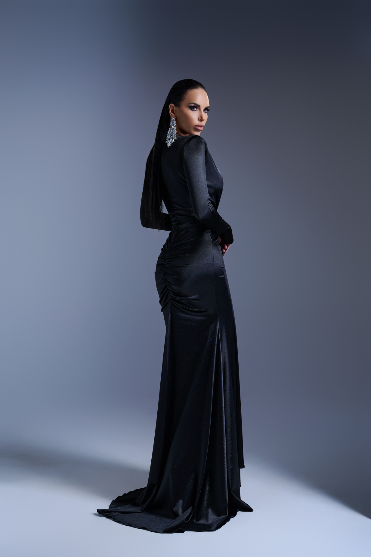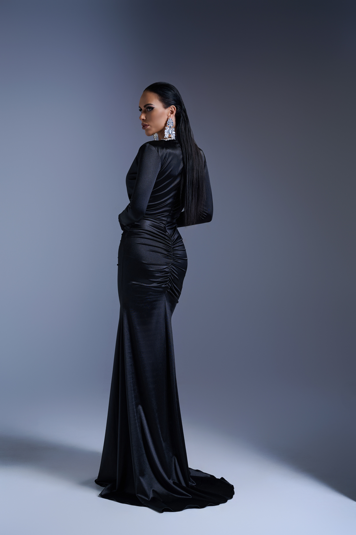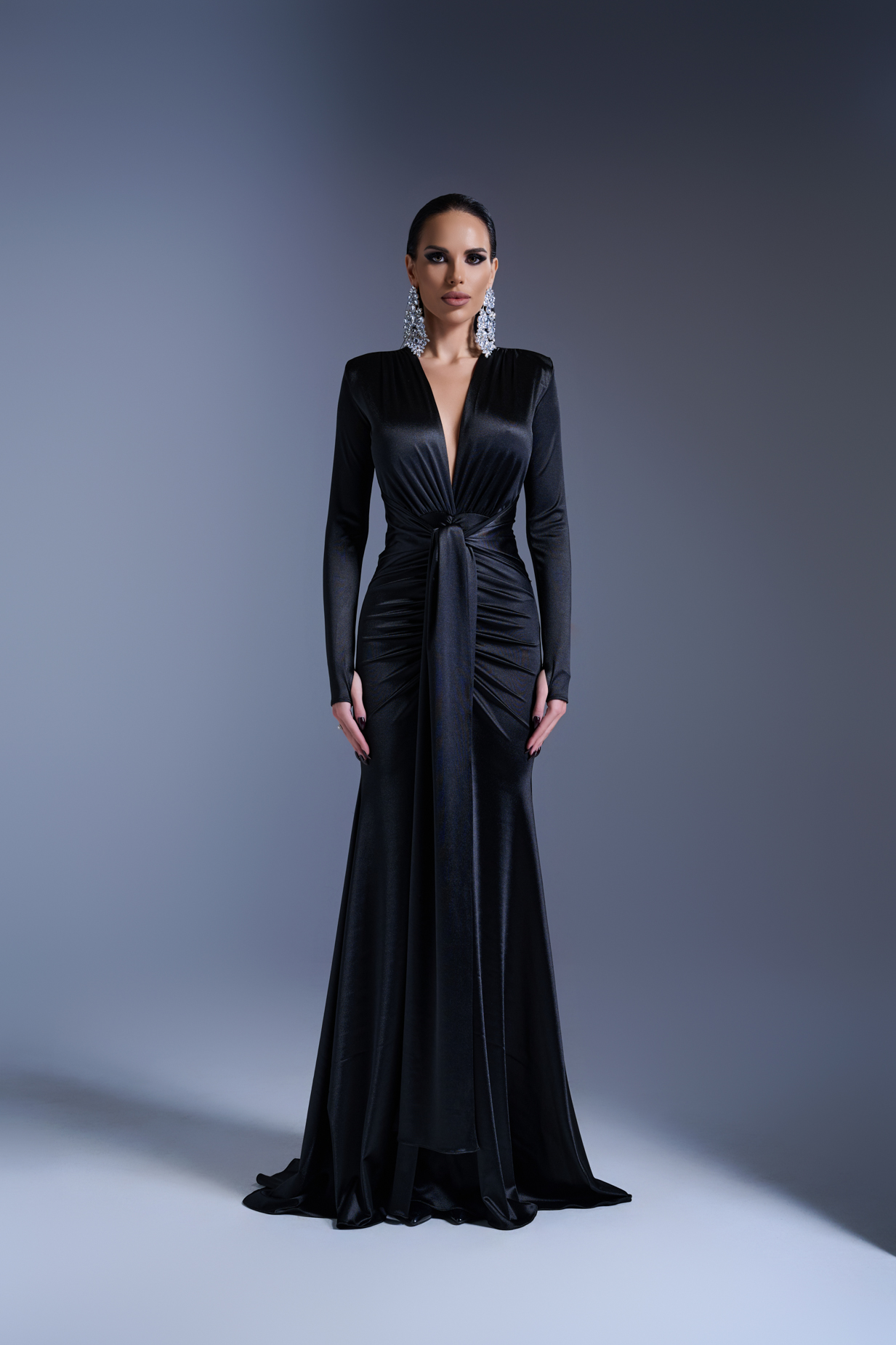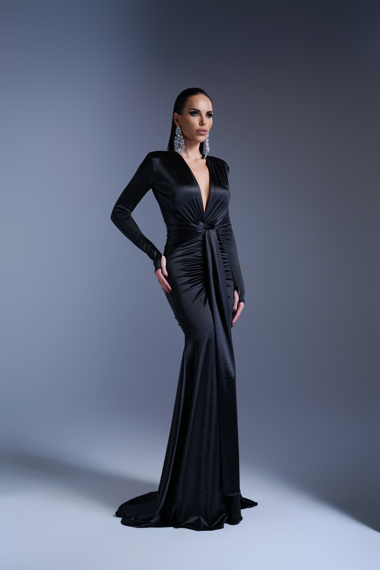 Дълга вечерна рокля по тялото от плътна сатенирана еластична материя, която следва естествените линии на силуета. Дълбокото V-деколте и набраните детайли отпред и в седалището оформят изваяна и женствена фигура, докато шлейфът придава удобство при движение и доза драматичност. Дългите шалове, свободно завързани отпред, падат до земята, издължават силуета и добавят финес на визията. Роклята излъчва уверена елегантност и съвременна чувственост, съчетавайки минимализъм с драматичен ефект — идеална за жени, които избират силно, модерно и изискано присъствие на гала вечери и специални събития.