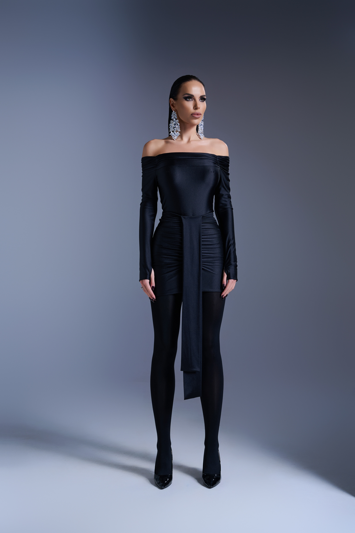 Изработена от еластична ликра с фин блясък, midnight silhouette е къса пола до средата на бедрото, която приляга към тялото и подчертава силуета.