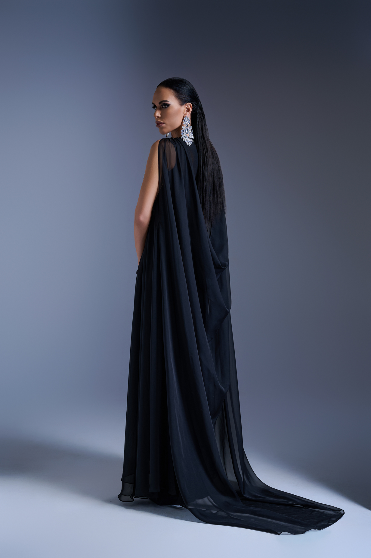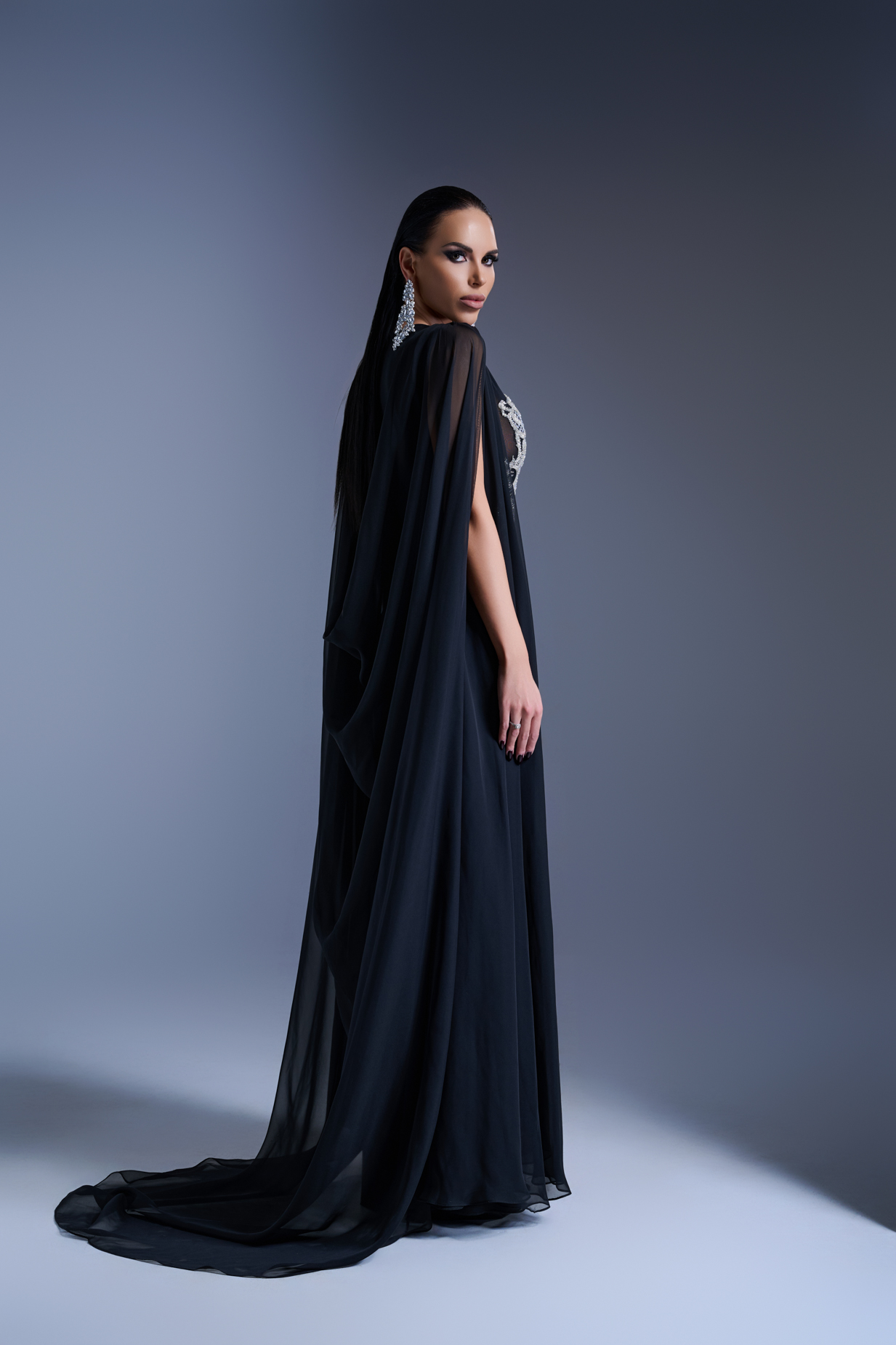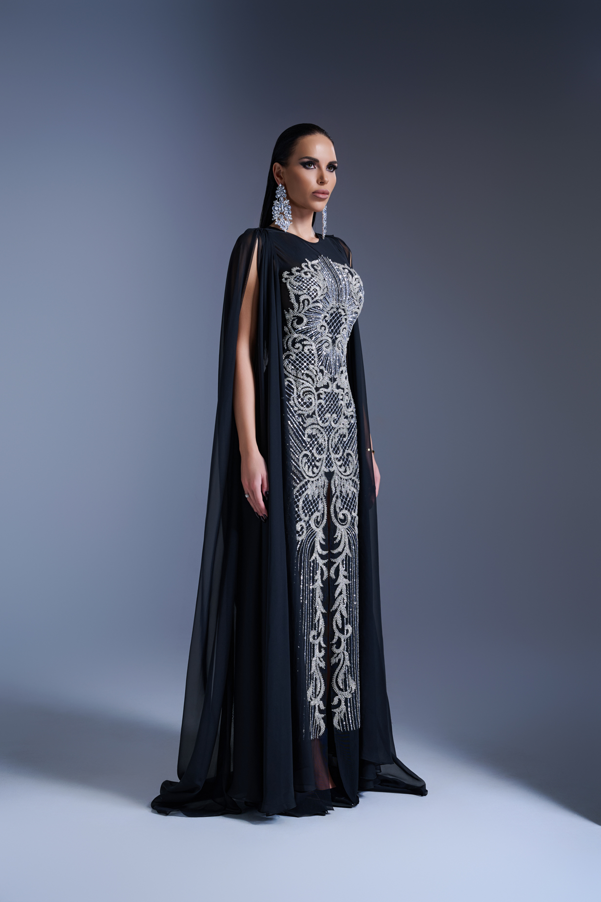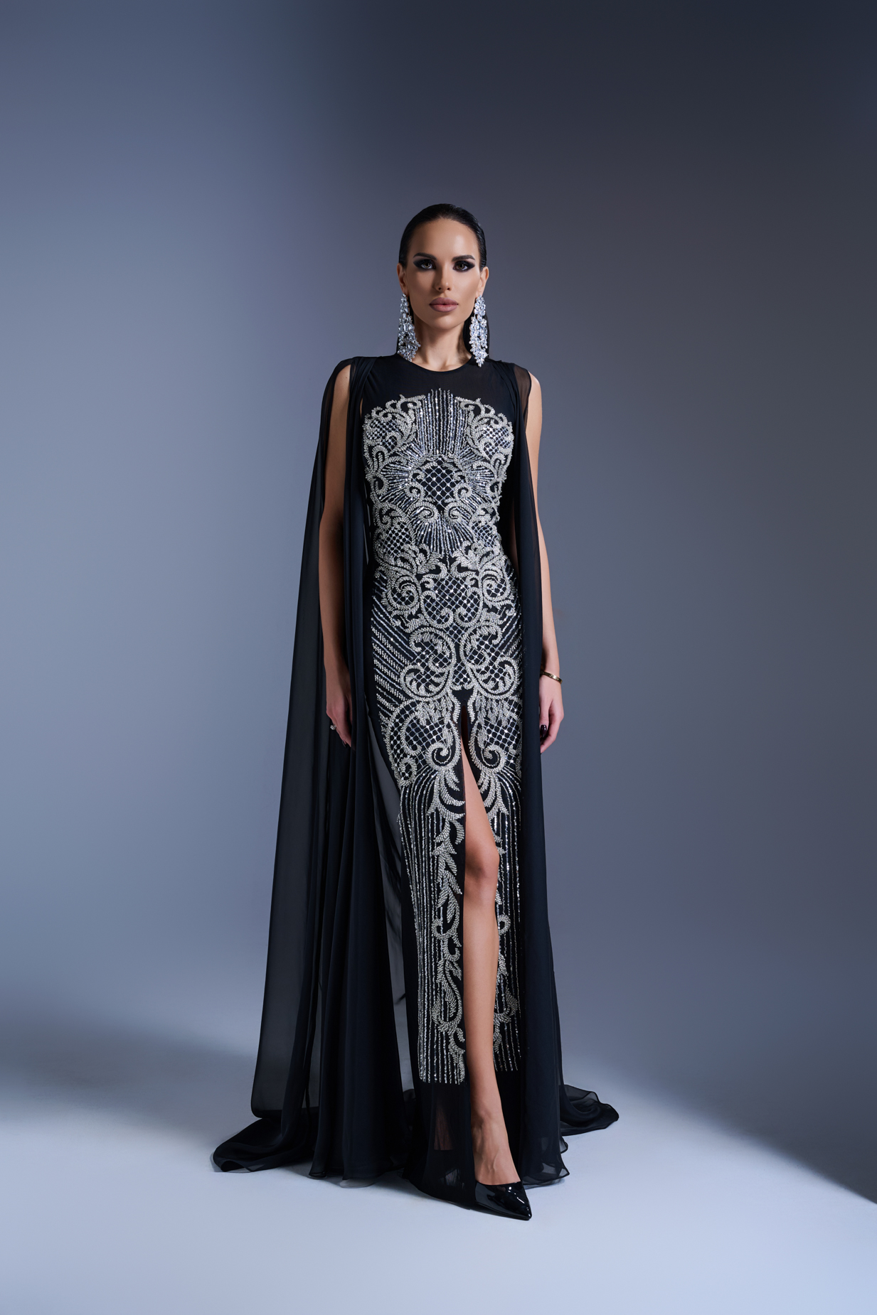 Дълга вечерна рокля по тялото, изработена от еластична мрежа, която деликатно обгръща и извайва силуета. Цялата предна част е покрита с ръчно бродирана сребриста дантела, щедро инкрустирана с кристали, отразяващи светлината с фин, луксозен блясък. Елегантната предна цепка придава дискретна чувственост, балансирана от ефирен воал, който завършва визията с лекота и грация. Силует, изграден върху идеята за модерна изтънченост и неподправен лукс — рокля, създадена за жени, които ценят съвършенството във всеки детайл.